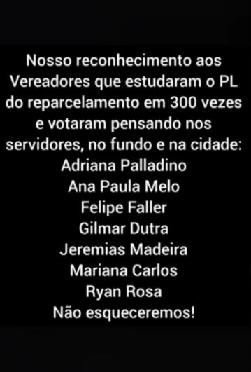 Colegas, teremos muitas lutas pela frente. Não podemos esquecer e precisamos valorizar quem está ao lado dos servidores e da cidade. Fora do seu horário de trabalho, divulgue em suas redes sociais este agradecimento aos Vereadores que nos apoiaram.